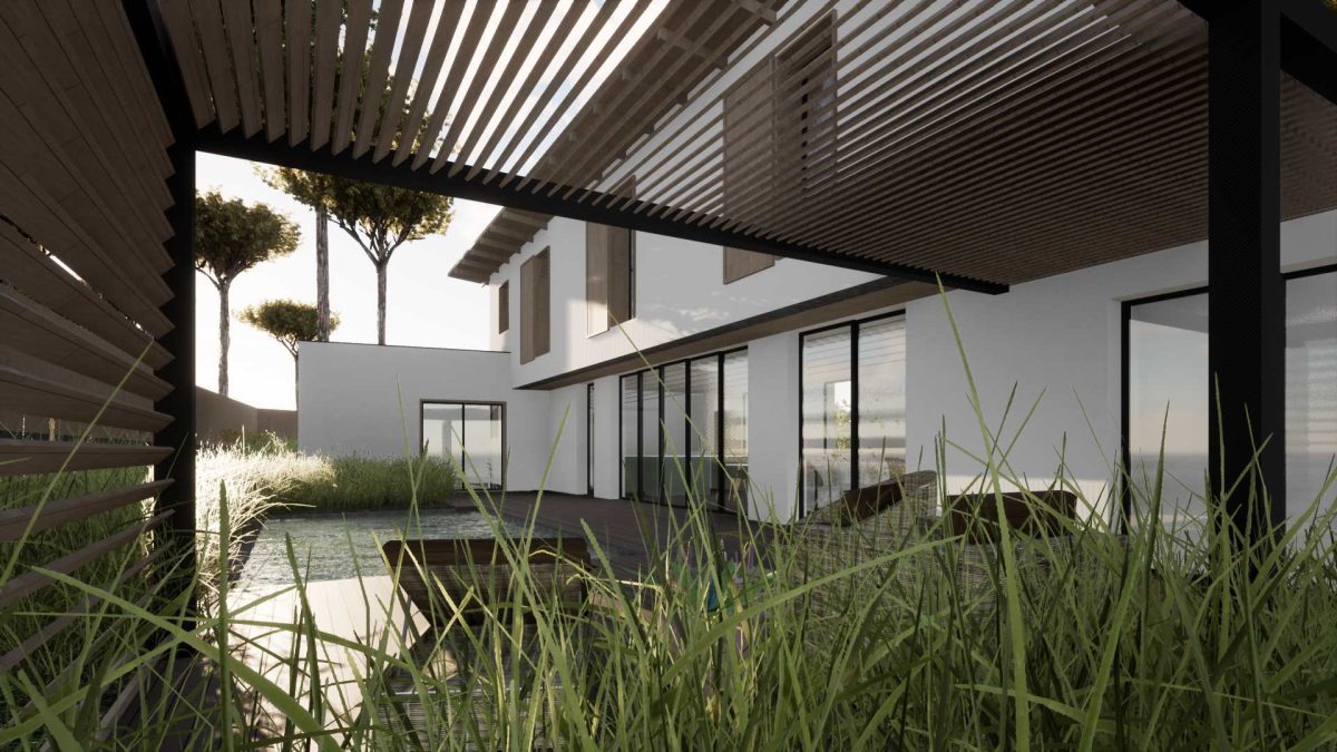 La petite surface du terrain est également déjouée avec la création d’une chambre d’ami indépendante, attenante à la piscine et le garage est à l’arrière de la villa. La signature architecturale de l’ensemble prend sa source dans l’esprit plage du quartier Chiberta, mis en avant par le blanc et le bois naturel.